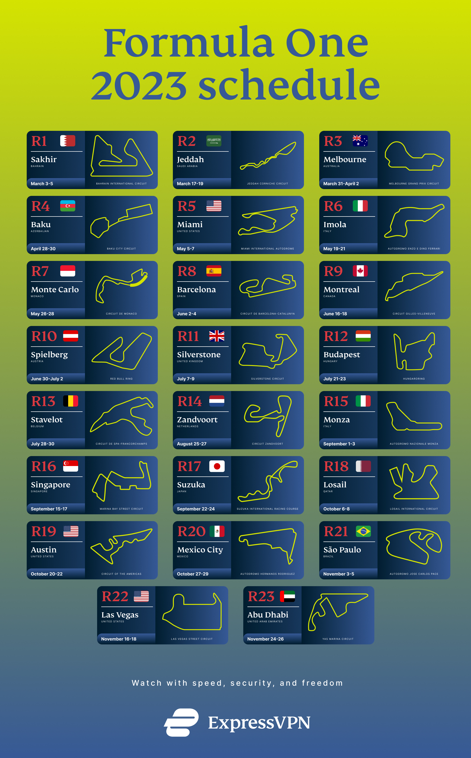 The season kicks off on March 3-5 at the Bahrain International Circuit for a thrilling night-time event in the desert. This is the first race of a packed 23-round schedule, the longest in F1 history, with the season culminating in Abu Dhabi at the Yas Marina Circuit on November 24-26.