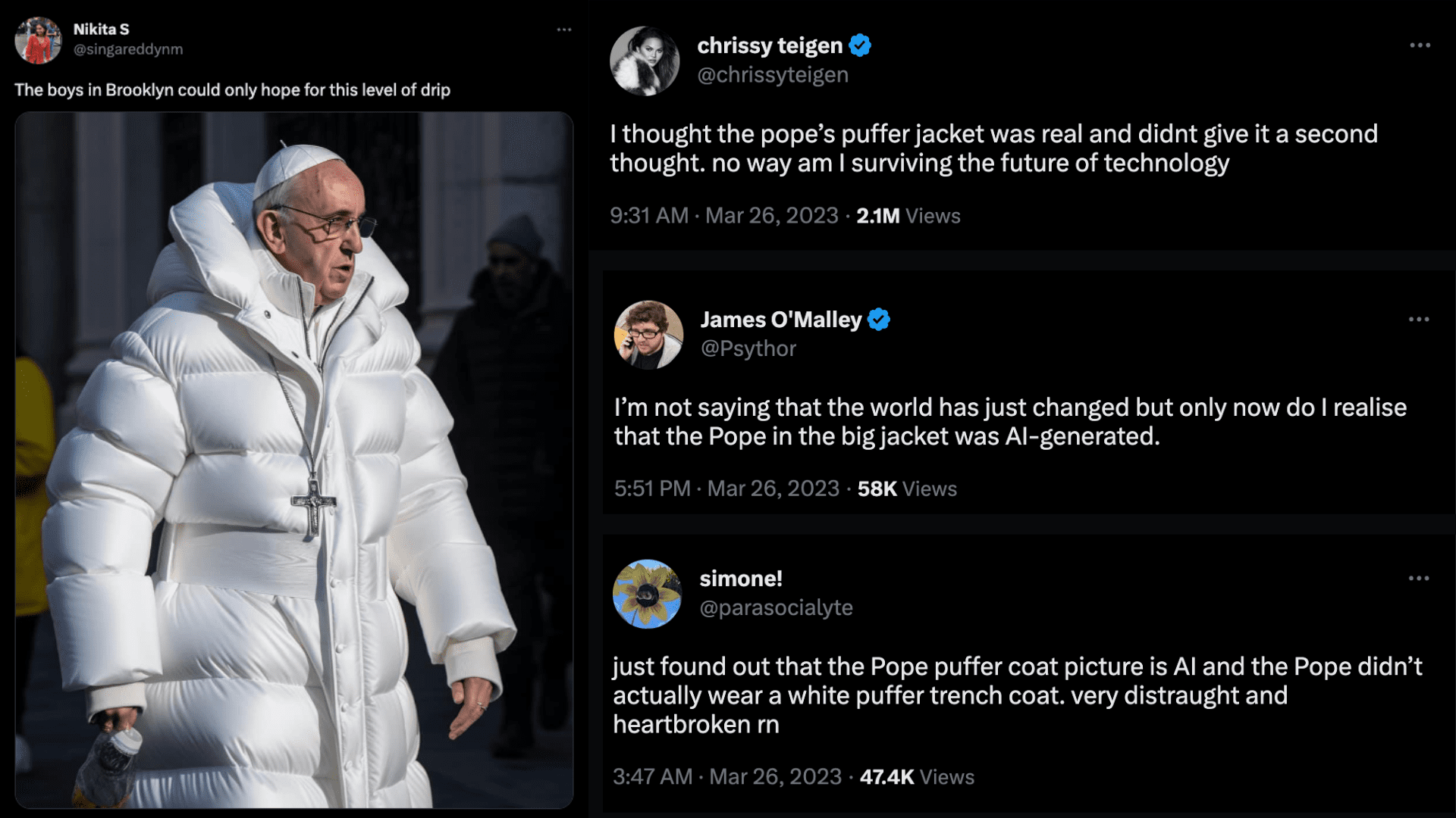 The technology has advanced to the point where these deepfakes can be almost indistinguishable from real content without expert analysis. For example, remember those AI-generated deepfake photos of Pope Francis in a large white puffer coat that fooled users online last year?