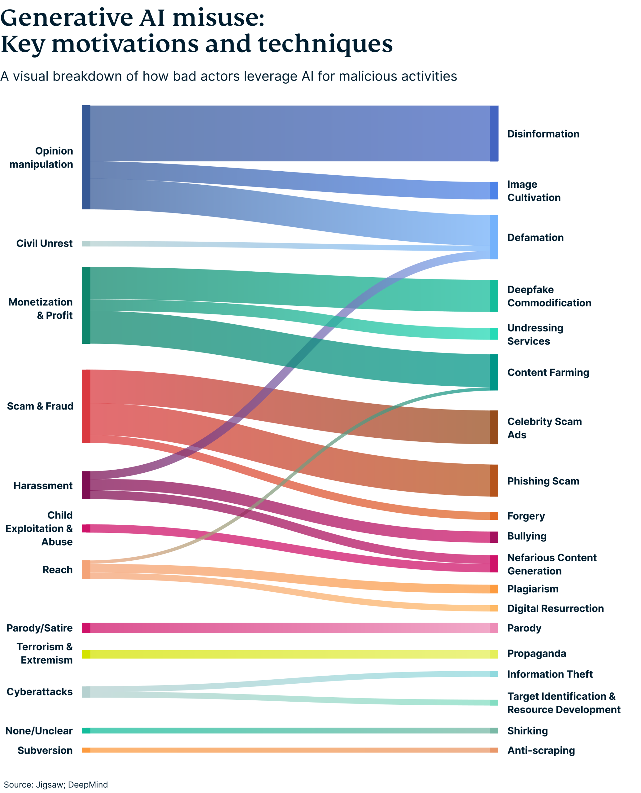A recent Google DeepMind study found that swaying public opinion is the most common malicious goal of using generative AI, primarily through deepfake media. This creation of realistic but fake images, videos, and audio of people was almost twice as common as the next highest misuse of generative AI tools, which was the creation of text-based misinformation online content.