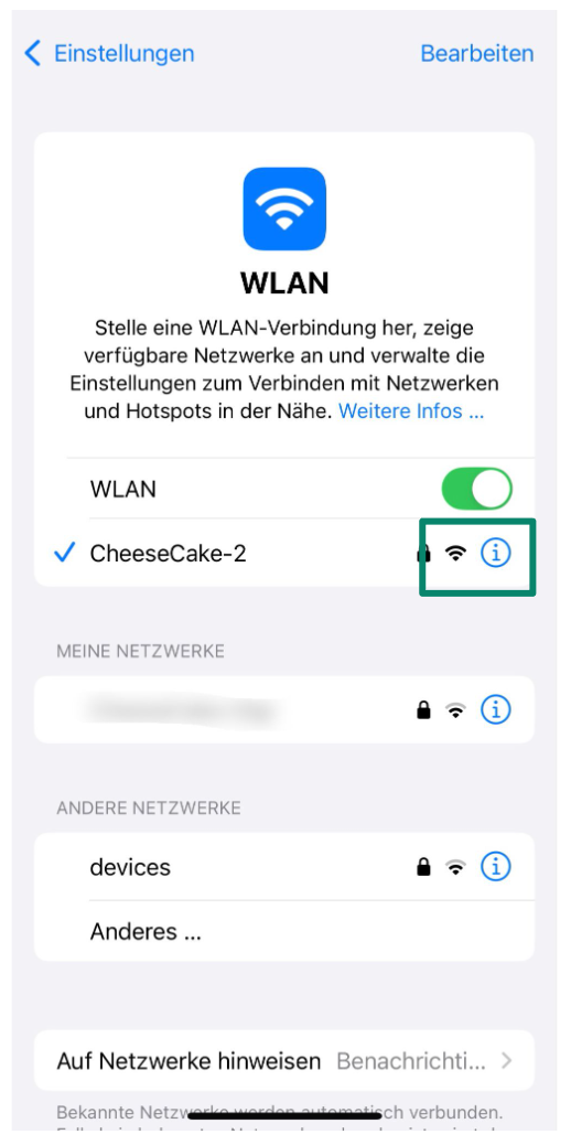 2. Finden Sie das Netzwerk, womit Sie verbunden sind und tippen dann auf das kleine Symbol (i) neben dem Namen Ihres Netzwerks.