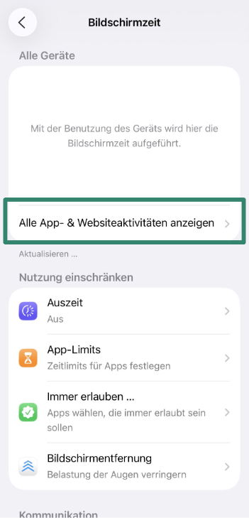 - Sobald der Passcode eingerichtet ist, tippen Sie auf Alle App- & Website-Aktivitäten einsehen, um die Nutzung Ihres Kindes zu sehen und sie entsprechend zu verwalten.
