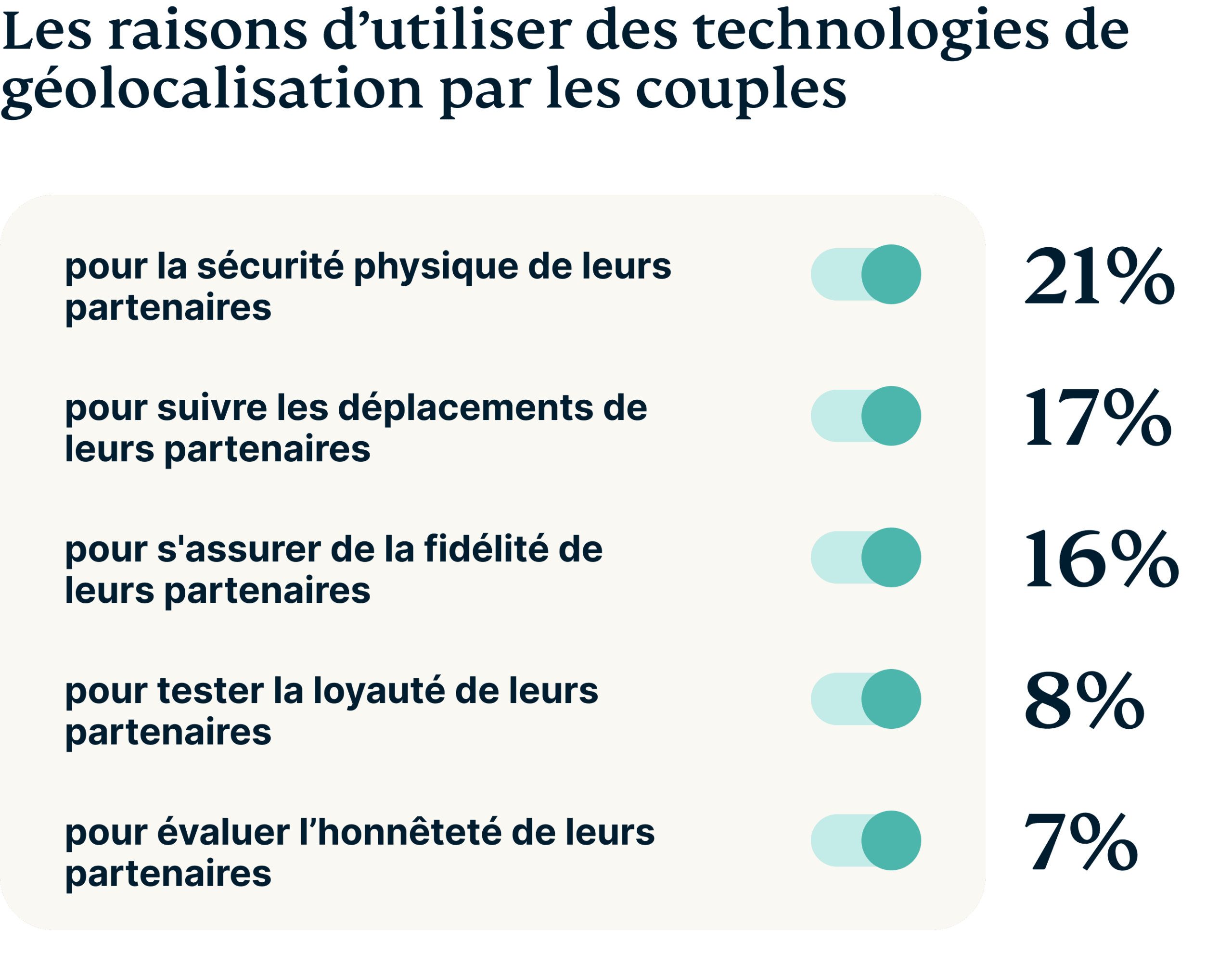 La moitié des personnes interrogées admettent utiliser le partage des données de localisation pour suivre leurs partenaires. Pourquoi ? D'après nos recherches, 21 % des couples utilisent cette fonctionnalité pour assurer la sécurité physique de leurs partenaires, 17 % pour savoir où ils se trouvent et 15 % pour des doutes quant à leur fidélité.