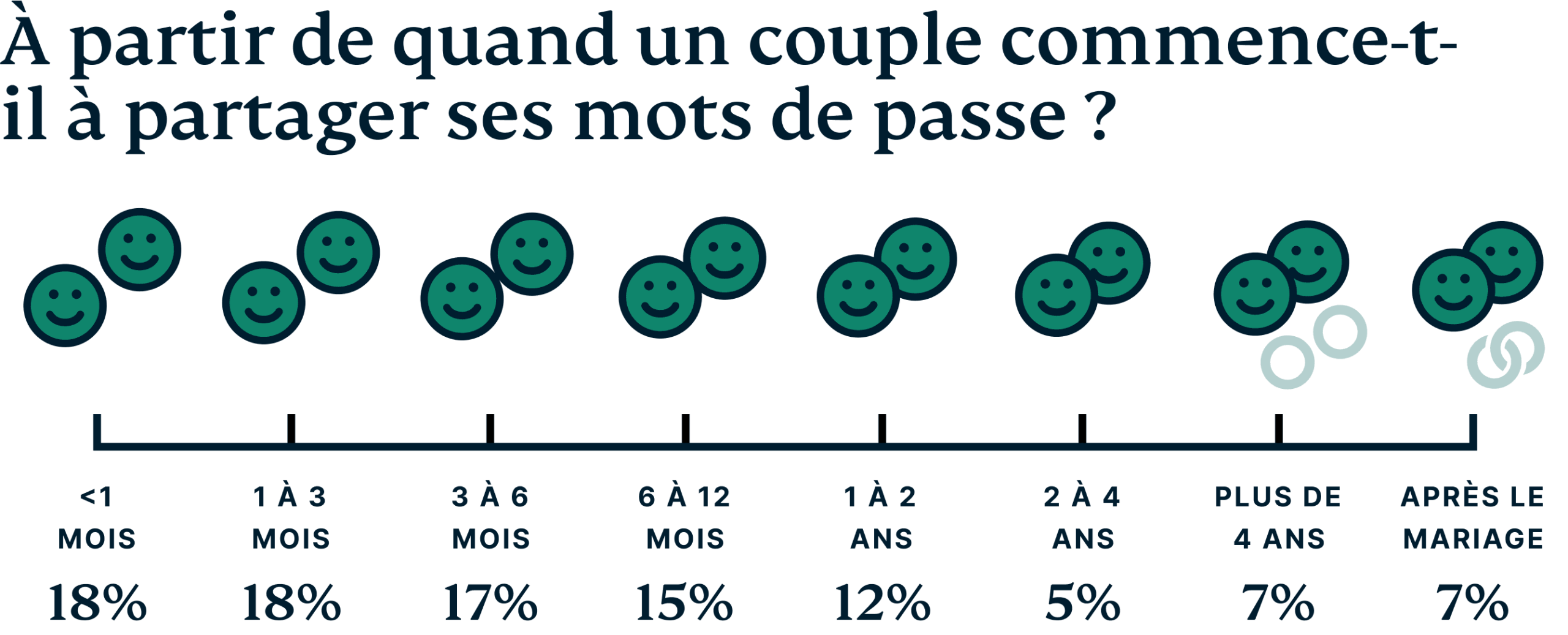 Chaque couple évolue différemment dans sa relation, et il en va de même pour le partage de mots de passe. Si 7 % des couples attendent de se marier avant d'échanger leurs mots de passe (contre 35 % pour les couples américains). Un bon nombre de personnes interrogées le font beaucoup plus tôt, 18 % le faisant dès le premier mois de leur relation.