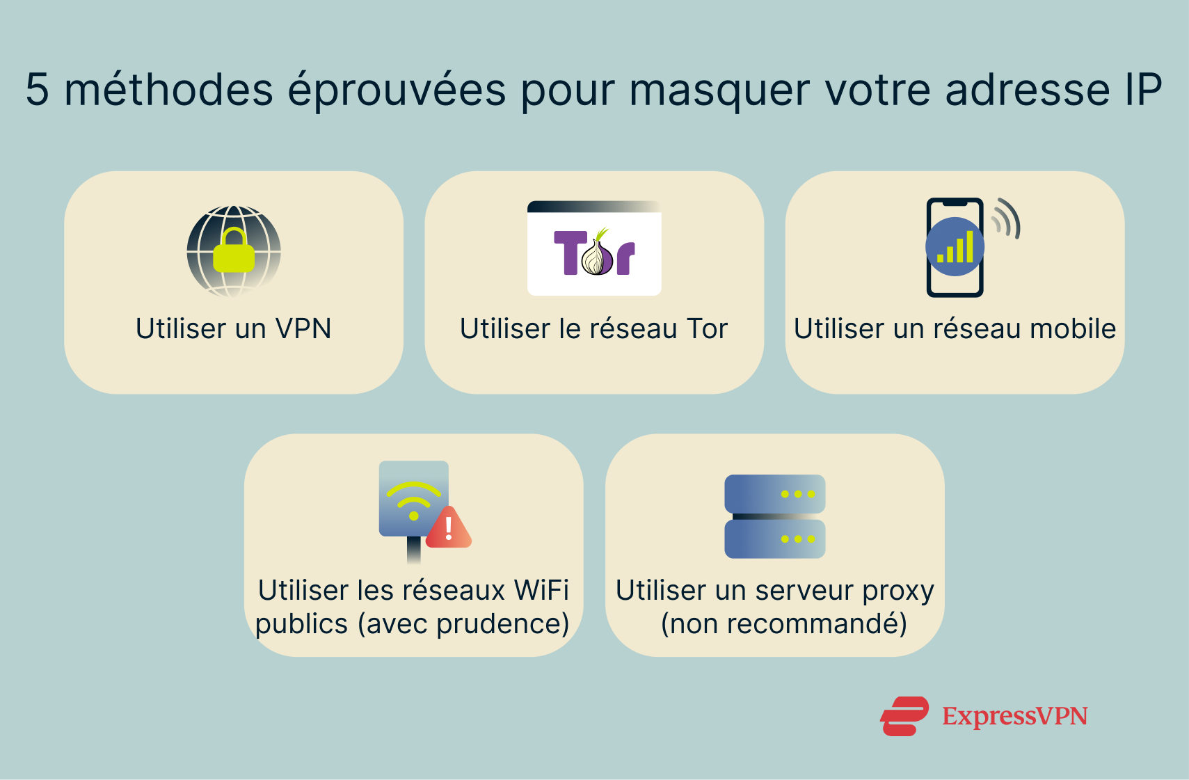 Il existe plusieurs manières de cacher votre adresse IP et elles ont toutes des avantages et des inconvénients. Vous trouverez ci-dessous la liste des méthodes que vous pouvez utiliser pour protéger votre identité en ligne.
