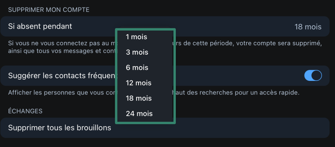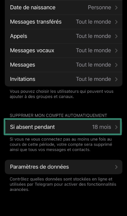 Toutefois, si vous avez activé le minuteur d'autodestruction de Telegram et que vous ne vous connectez pas pendant la durée définie (par exemple 1 mois), votre compte sera automatiquement supprimé après cette période d'inactivité.