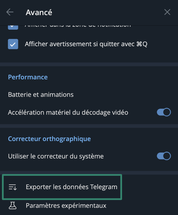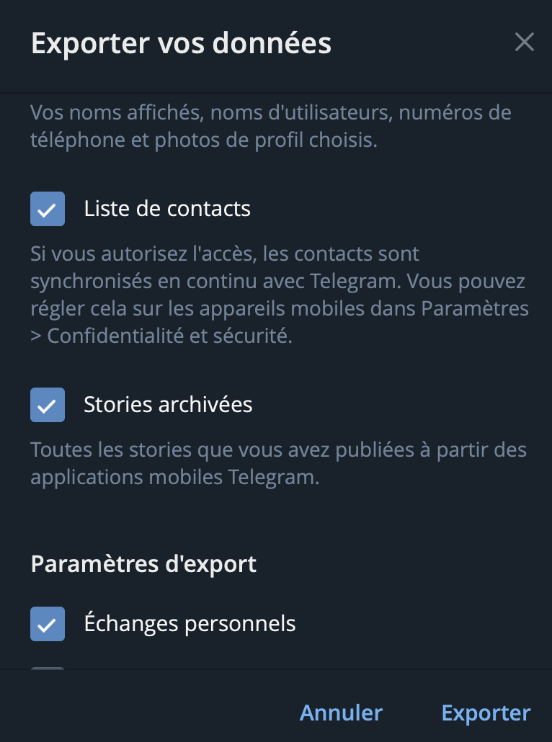 Avant de supprimer définitivement votre compte Telegram, il est judicieux d'exporter vos données, y compris vos discussions, vos médias et l'historique des groupes. N'oubliez pas que Telegram ne vous permet pas de restaurer ces données sur un nouveau compte. Une fois exportées, elles ne peuvent être utilisées qu'à des fins de sauvegarde.