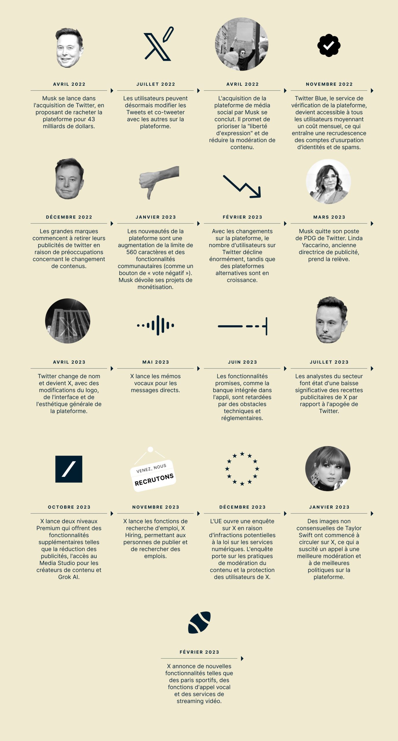 Avant d'aller plus loin, voici un récapitulatif rapide des évènements clés et des principaux changements survenus chez X depuis l'acquisition par Musk. Cette chronologie met en évidence les annonces publiques et les changements majeurs.