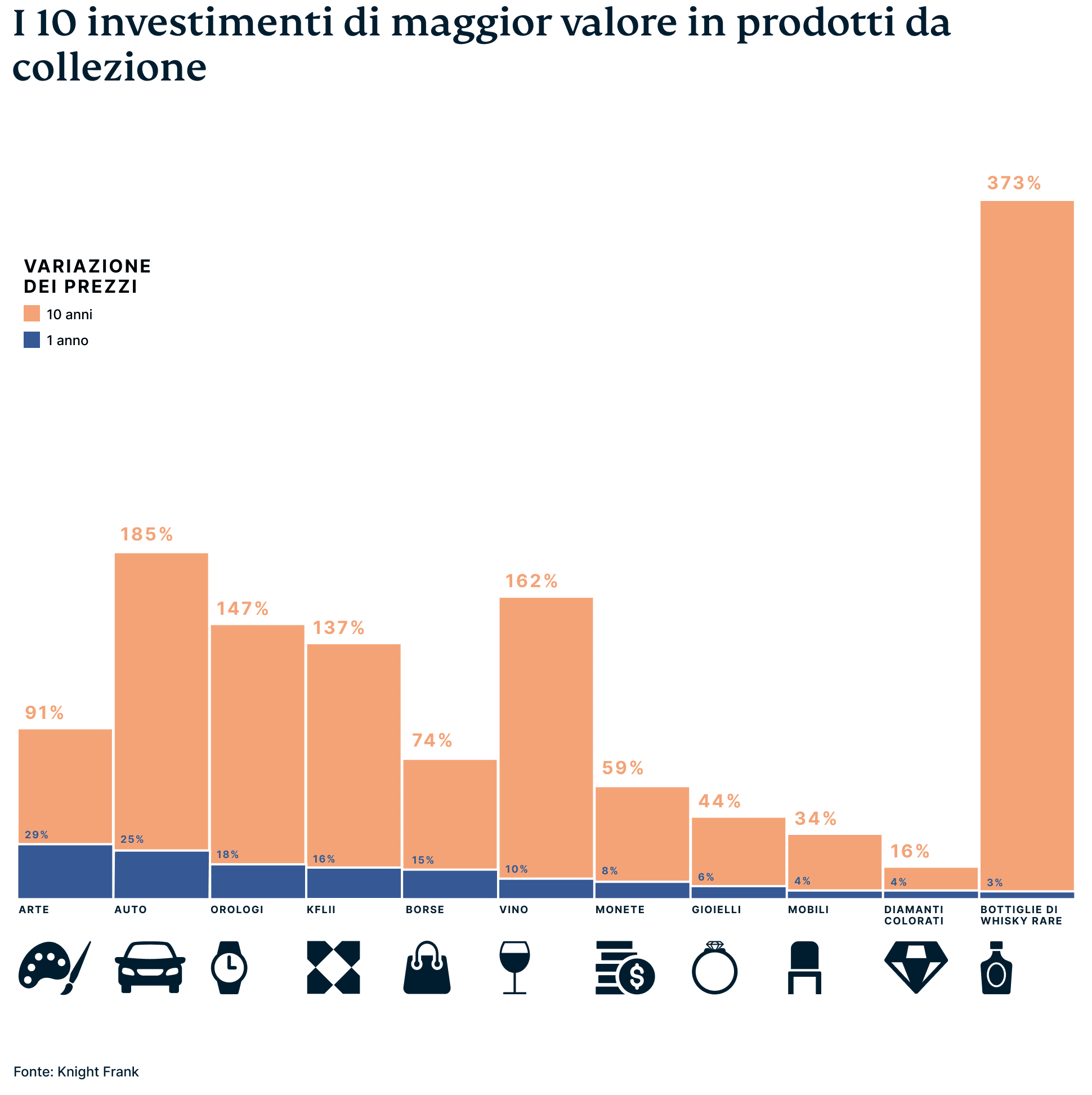 Gli investimenti in prodotti da collezione, che comprendono asset digitali e beni reali come NFT, whisky rari, opere d'arte e oggetti di lusso, hanno guadagnato terreno per il loro fascino unico e la loro impressionante crescita. In effetti, questi asset alternativi superano gli investimenti tradizionali come l'oro e le azioni, offrendo maggiore stabilità.