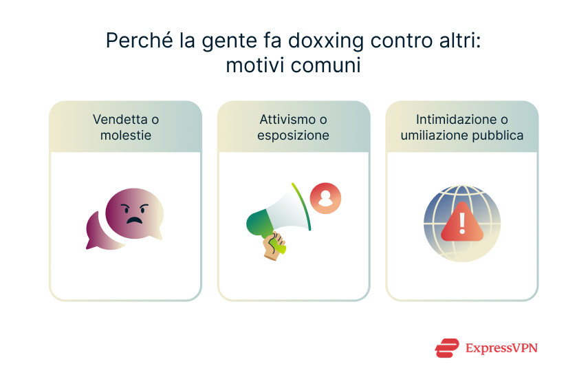 Il doxxing viene comunemente usato per vendicarsi di qualcuno, come un ex amico, un ex partner o semplicemente un rivale in una discussione online. Pubblicare apertamente le informazioni private di una persona può farla sentire esposta, vulnerabile e insicura.