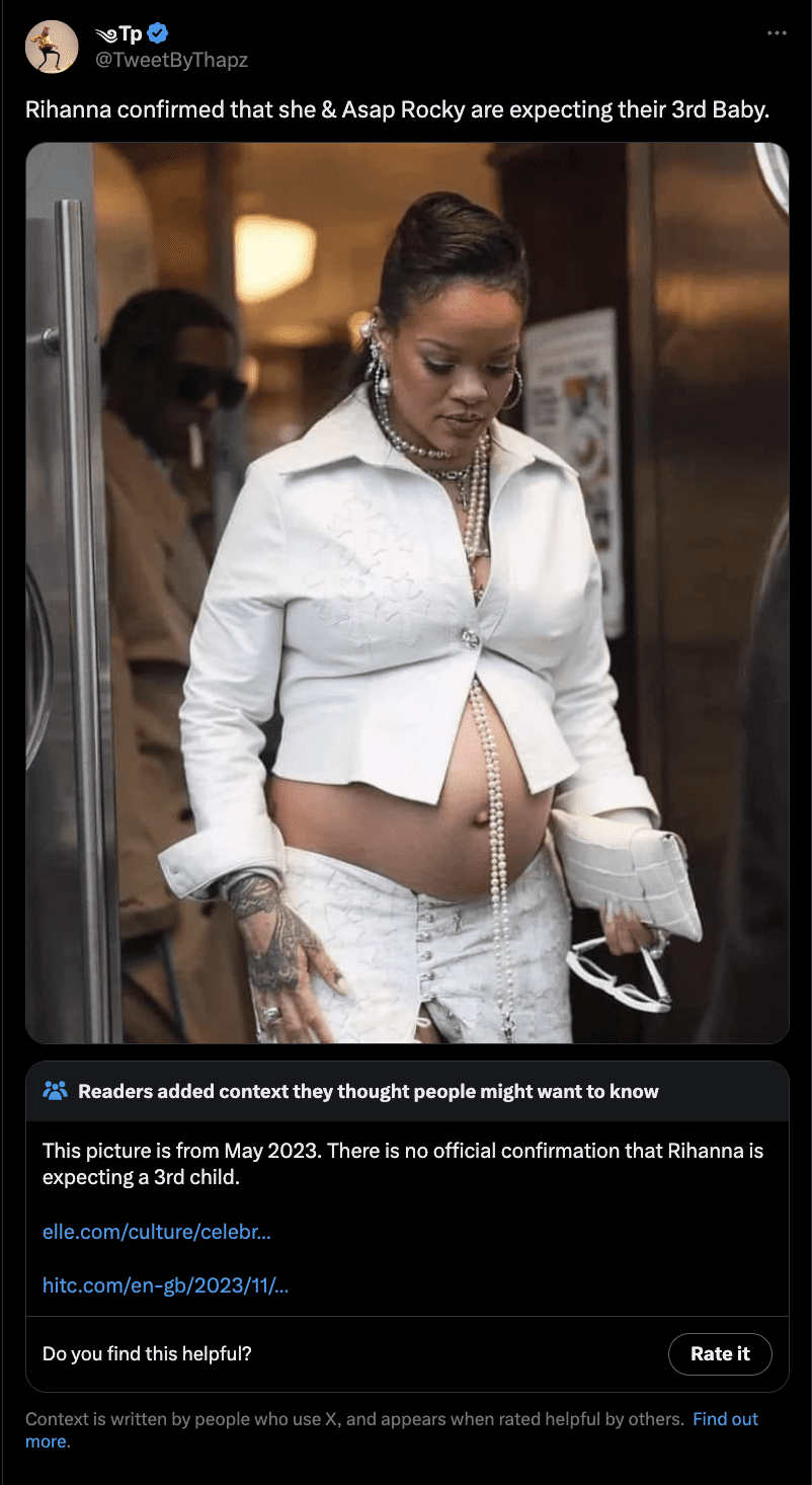 Rihanna e Meghan Markle si sono trovate al centro di fake news sui bebè quest'anno, che le hanno portate a occupare rispettivamente il 5° e il 6° posto del nostro indice. Un video deepfake che mostrava fintamente una Rihanna incinta del suo terzo figlio ha fatto scalpore. Nonostante abbia dato alla luce il suo secondo figlio con A$AP Rocky nell'agosto del 2023, durante il weekend del Veterans Day si è diffusa rapidamente una voce secondo la quale Rihanna sarebbe stata in attesa di un altro bambino, ma era completamente falsa.
