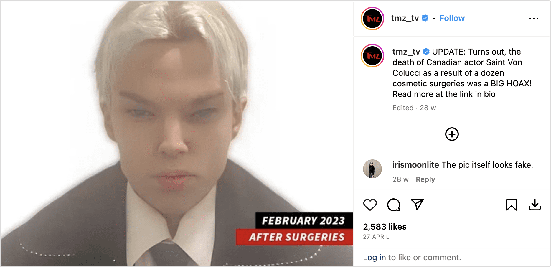 Un esempio scioccante è stata la storia di Saint Von Colucci, un presunto attore e cantante che sarebbe morto dopo essersi sottoposto a diversi interventi chirurgici per assomigliare a Jimin dei BTS. I media di tutto il mondo hanno riportato la notizia della sua presunta morte, dei suoi interventi chirurgici da 200.000 dollari e del suo ruolo in un telefilm coreano. Ma Von Colucci non è mai esistito. Le prove suggeriscono che si tratta di una bufala generata dall'intelligenza artificiale che è riuscita a ingannare i media di tutto il mondo.