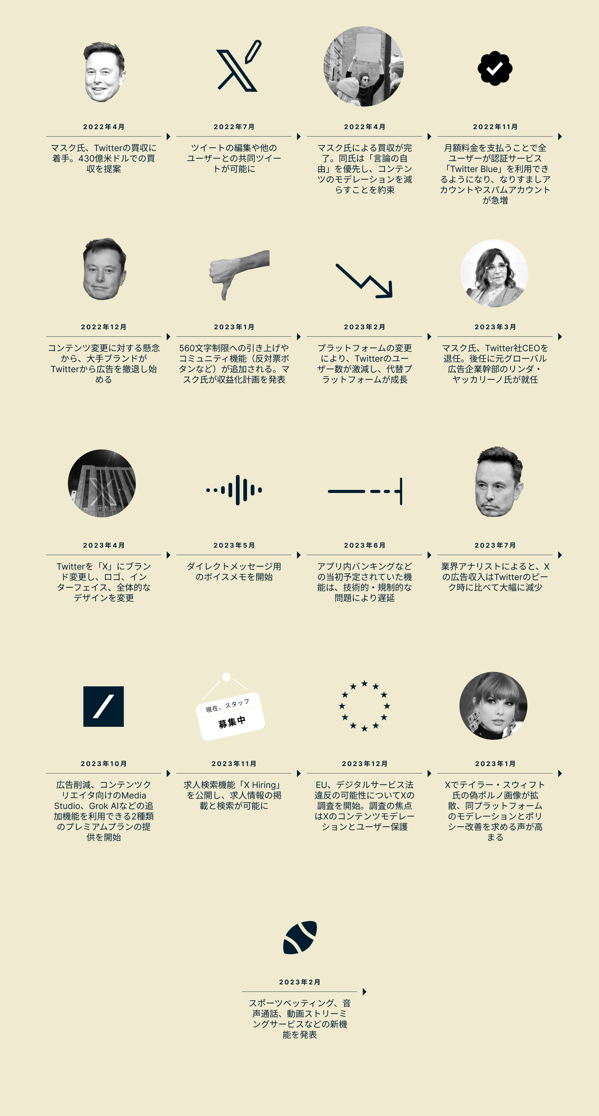 より深く掘り下げる前に、マスク氏の買収以降のXの主要な出来事と主な変化を簡単に振り返ってみましょう。この年表では、主な発表と変化をピックアップしています。