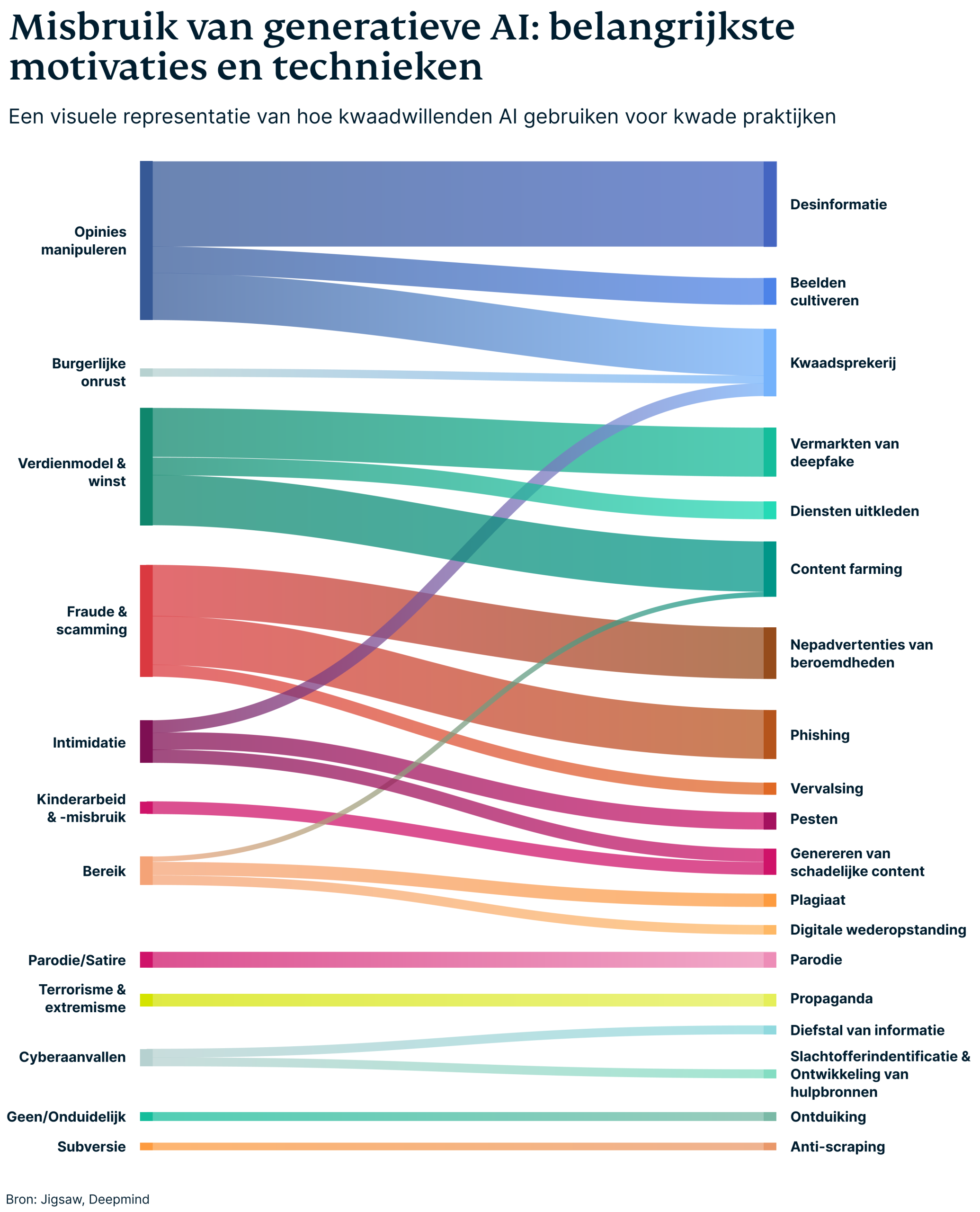 Uit een recent onderzoek van Google DeepMind bleek dat het meest voorkomende kwaadaardige doel van het gebruik van generatieve AI is: het beïnvloeden van de publieke opinie, voornamelijk via deepfake-media. Het maken van realistische maar valse beelden, video’s en audio van mensen kwam bijna twee keer zo vaak voor als het daaropvolgende misbruik van generatieve AI-tools, namelijk het creëren van op tekst gebaseerde online-content met desinformatie.
