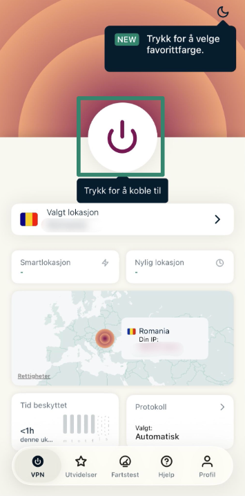 5. Klikk på «Hurtigtilkobling» for å koble til og skjule IP-adressen din.
