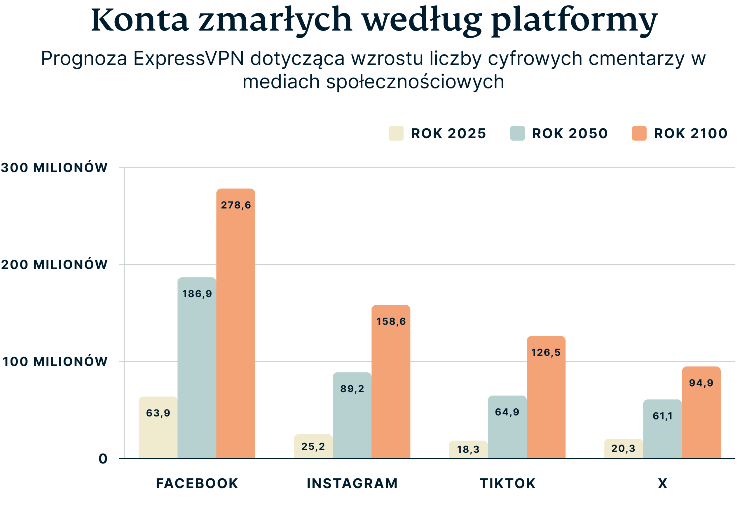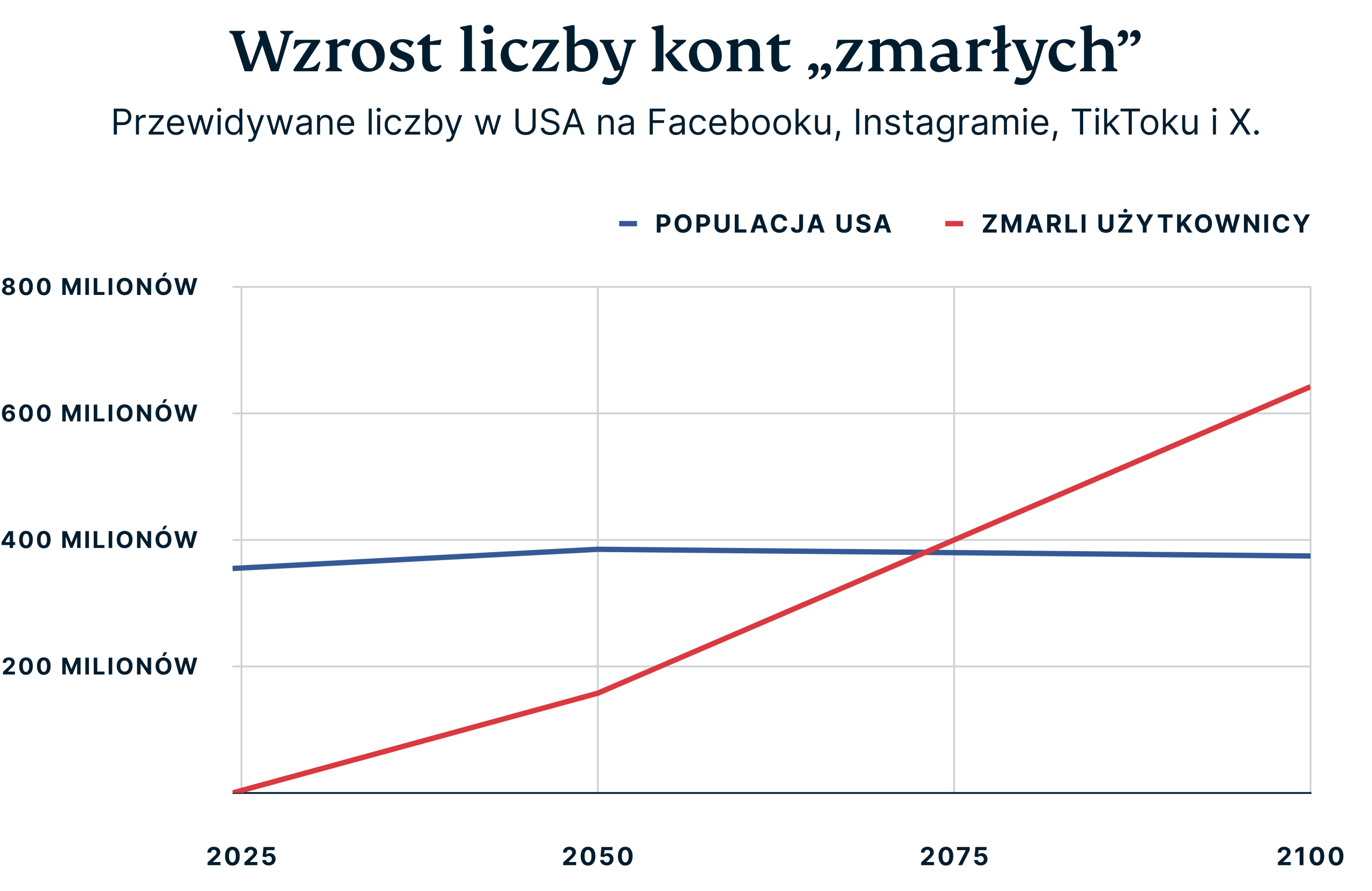 • W szczególności wyróżnia się sytuacja w Stanach Zjednoczonych, gdzie do 2100 roku spodziewamy się 659 milionów kont zmarłych, czyli prawie dwukrotnie więcej niż wynosi populacja tego kraju.