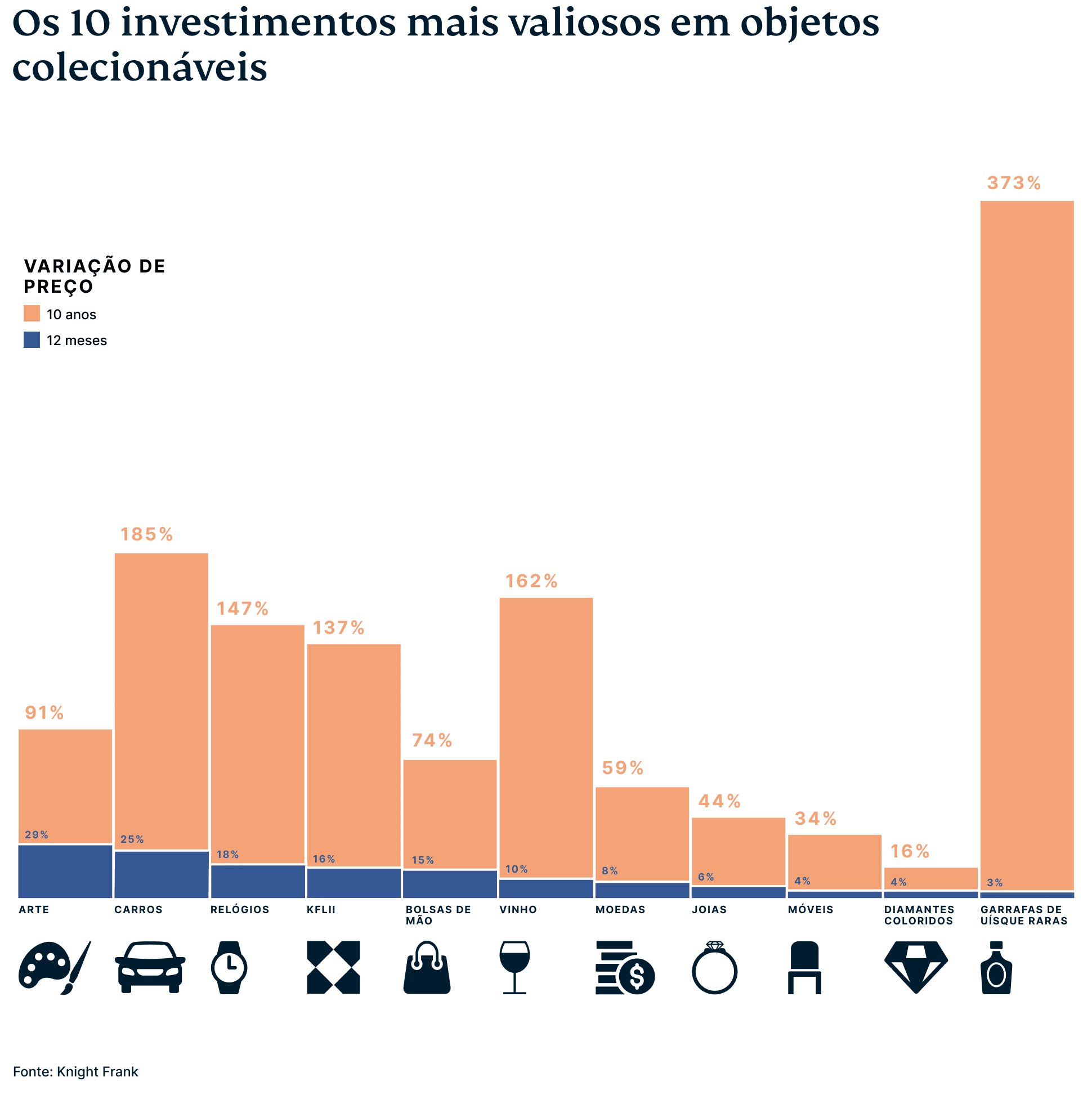 • Investimentos em itens colecionáveis, como uísques raros, arte, artigos de luxo e carros são relativamente estáveis em comparação com o Bitcoin, com potencial para altos retornos.