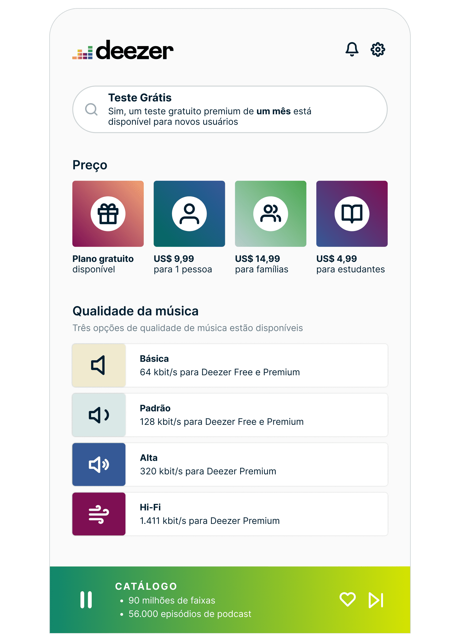 • Outras plataformas como Deezer, Tidal e Pandora têm ofertas e modelos de preços exclusivos, com foco na descoberta de músicas e áudio de alta qualidade.