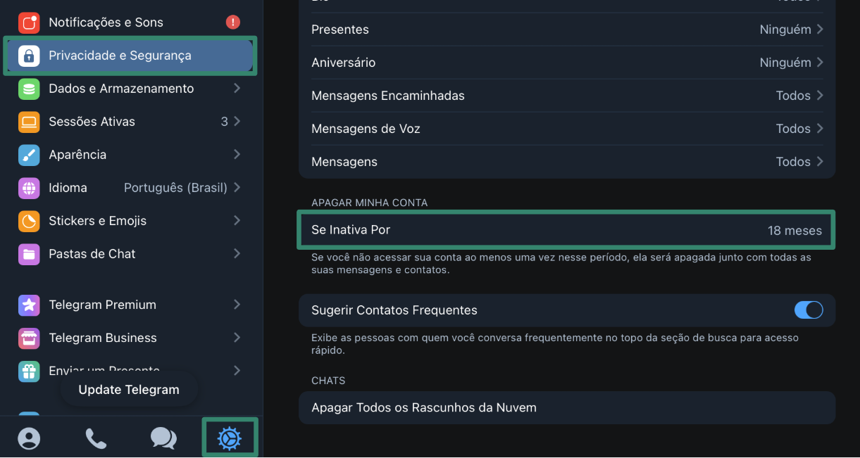 - Contas inativas são vulneráveis: se você não estiver acessando regularmente, sua conta pode se tornar alvo de hackers. Mesmo que você não a esteja usando, uma conta antiga do Telegram ainda pode conter informações confidenciais que você prefere manter seguras.