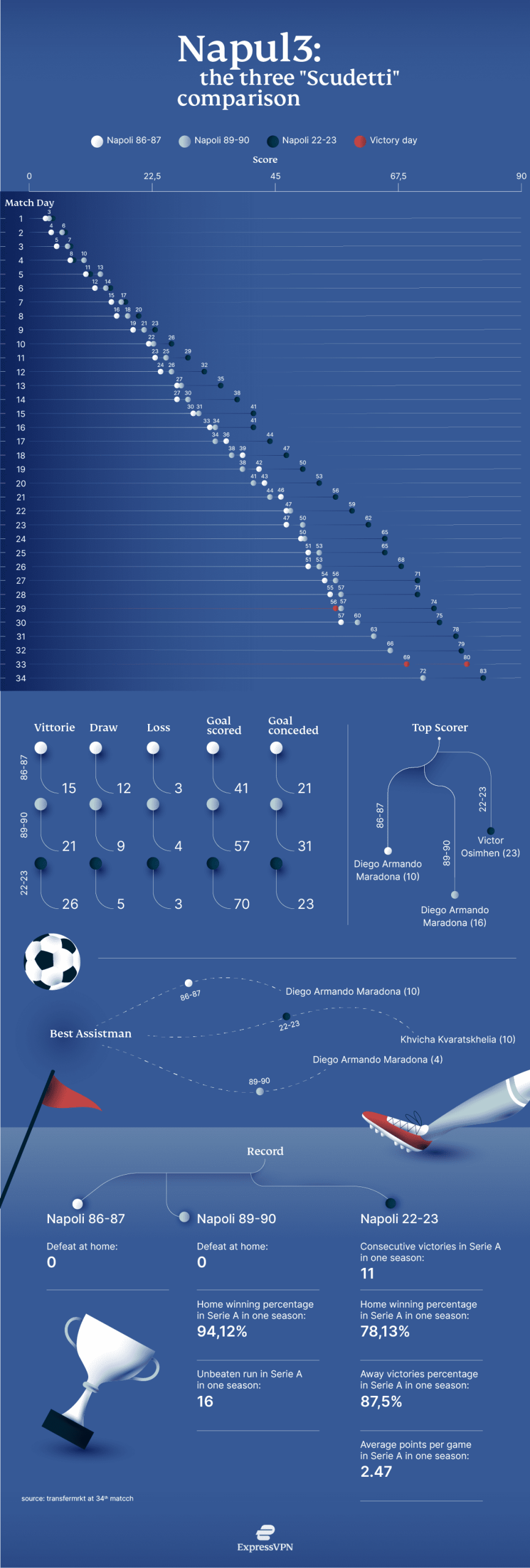 Since January, Neapolitan fans have exorcised superstition not only by celebrating the Scudetto much earlier but also by finding similarities between that period and the current one: both Corrado Ferlaino and Aurelio De Laurentiis waited 18 years to lead Napoli to conquer the first tricolor; both Ottavio Bianchi and Spalletti won in their second year on the bench with the Neapolitans; in the two years, the club from Campania has always lost the first match after the Christmas break; both seasons finished with the fewest losses and the most wins.