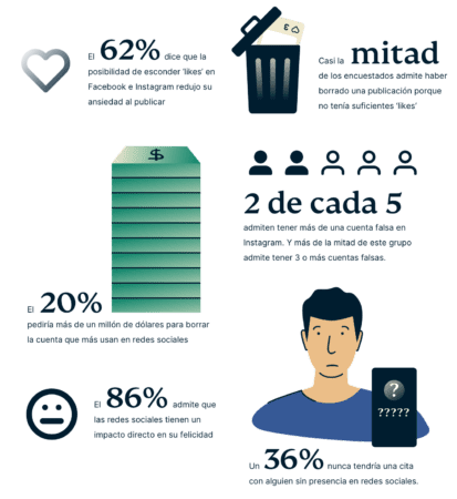 Pero ¿cómo les afecta esto? ¿Cómo influye en su comportamiento el tener que estar al dí­a con tantas redes? La mayorí­a de los encuestados admiten que el uso de las redes sociales tiene un impacto directo en su felicidad, autoestima y nivel de ansiedad. Las últimas actualizaciones de Instagram o Facebook, que permiten ocultar la cantidad de "likes" que recibe una publicación, han contribuido a reducir un poco la sensación de competencia relacionada con la popularidad de una publicación.