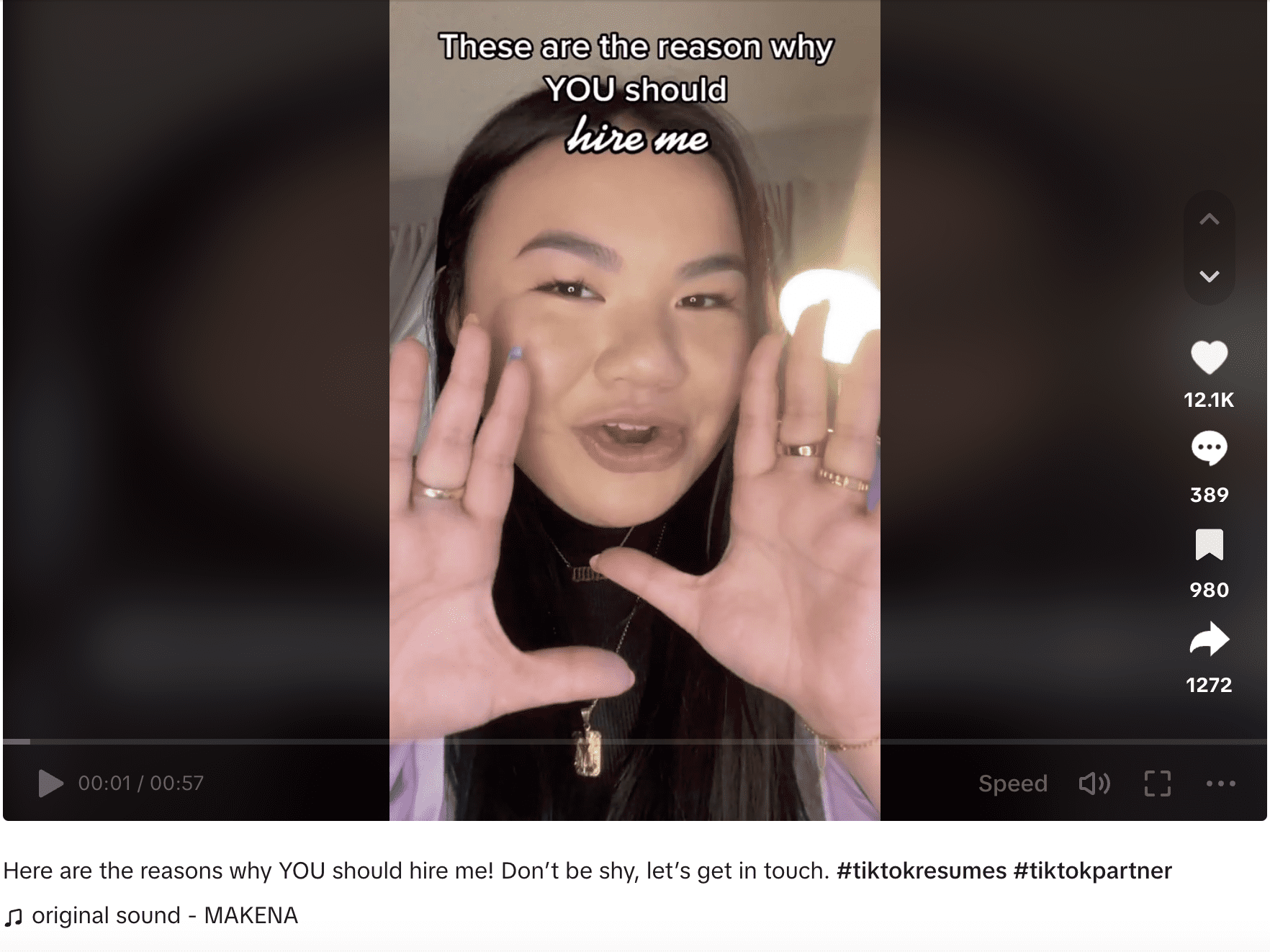 "Questi sono i motivi per cui dovreste assumermi", dice Makena Yee, una candidata di 23 anni di Seattle, mentre crea una delle storie di successo di TikTok Resumes. Dopo che il curriculum video è diventato virale, ha accumulato milioni di visualizzazioni e centinaia di commenti, tra cui frasi come "Qualcuno la assuma subitoooo!". Yee ha ricevuto più di 15 offerte di lavoro.