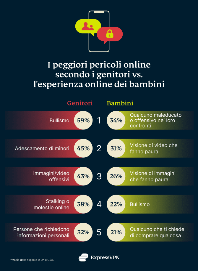 A conferma delle preoccupazioni dei genitori, il 22% dei bambini ammette di essere stato vittima di bullismo online. Il 17% dei bambini intervistati si è sentito chiedere da uno sconosciuto quale scuola frequenta e il 14% ha dichiarato che gli è stato chiesto l'indirizzo di casa.