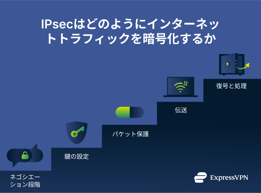 IPsecの暗号化プロセスは5つのステップに分けられます。