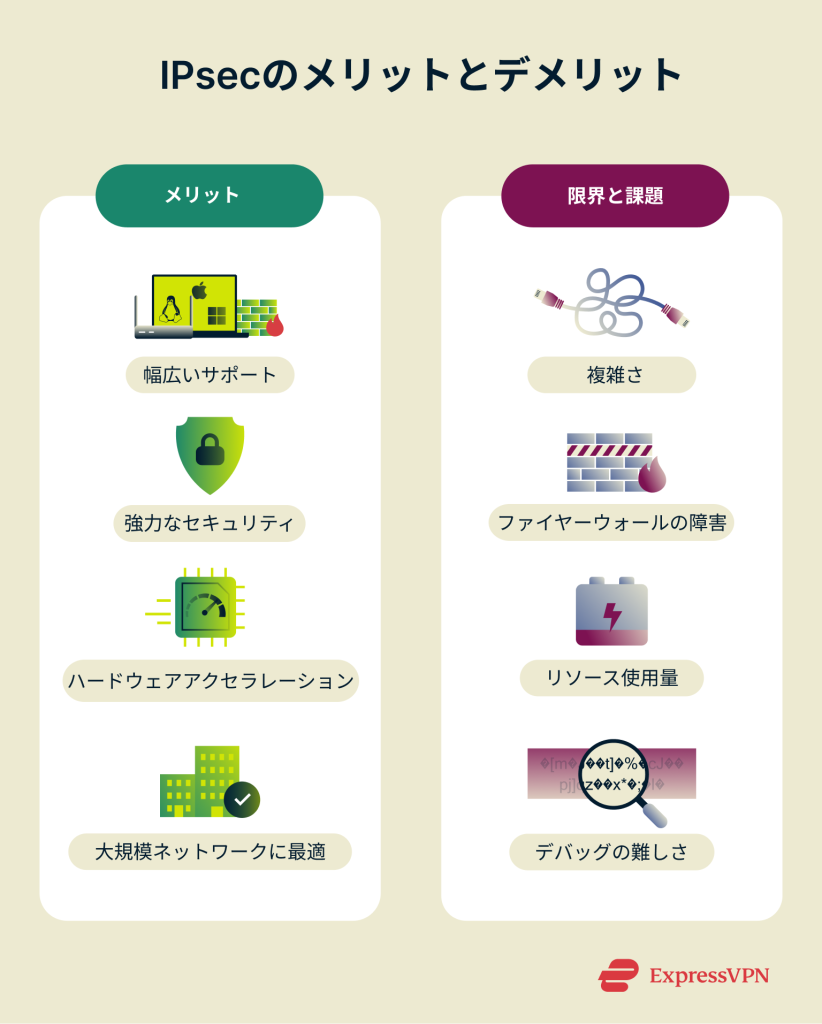 IPsec VPNの設定は最初は複雑に感じるかもしれませんが、多くの人がそれを選ぶのには理由があります。ここでは主な利点と欠点を見ていきましょう。