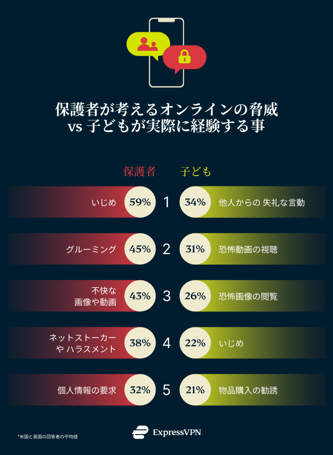 保護者に「ネット利用における一番の懸念は?」と尋ねたところ、回答者の59%が「自分の子どもがいじめに遭うことを最も心配している」と答えました。続いて、「子どもがネット上の性犯罪者に狙われること(グルーミング)」「子どもが不快なコンテンツに出くわすこと」「他のユーザーによるネットストーカーやハラスメントのリスク」などが挙げられています。