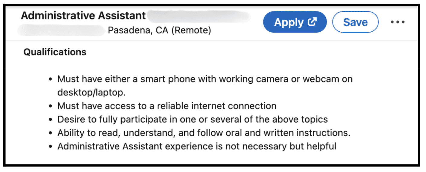 또한 급여는 상당히 높지만 요구 조건이 거의 없는 일자리도 주의하세요. 유령 일자리는 일반적으로 지원을 유도하기 위해 긴 특전 목록을 포함하지만 일상 업무에 대한 자세한 내용은 거의 제시하지 않습니다.