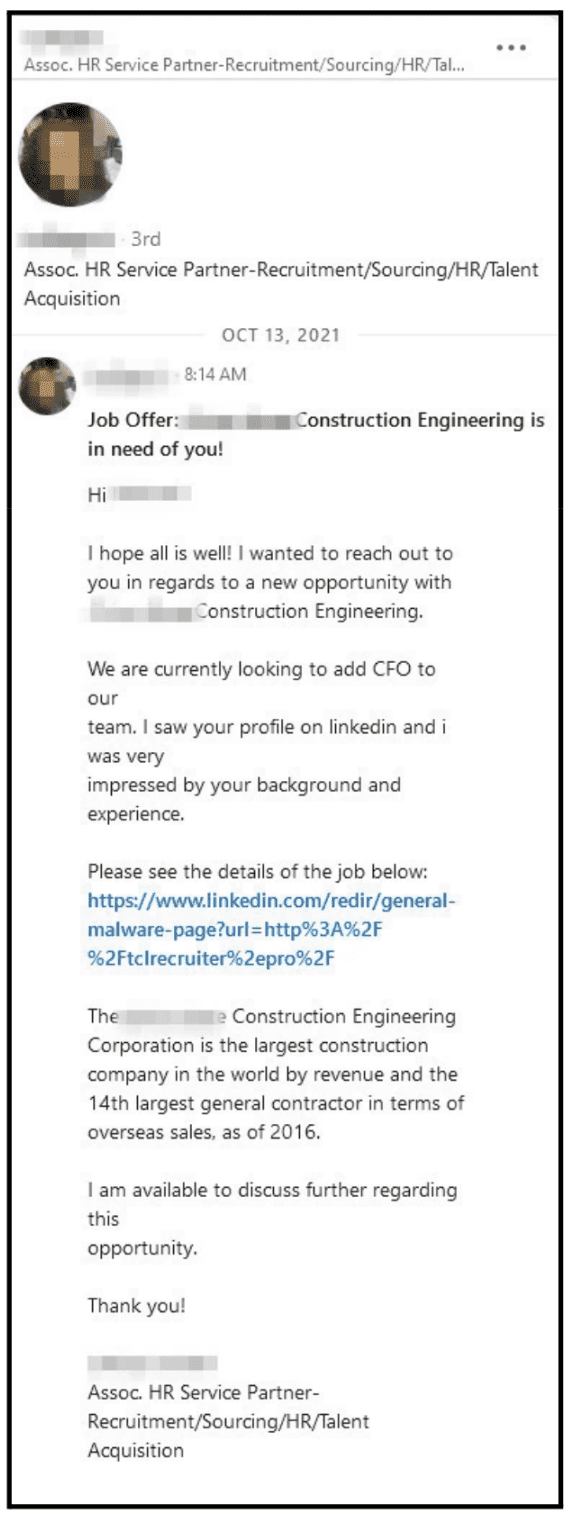 하지만 문제는 유령 일자리에만 그치지 않습니다. 링크드인과 유사한 사이트는 더 사악한 사기의 무대이기도 합니다. 가짜 채용 담당자는 존재하지 않는 일자리를 게시하여 순진한 구직자로부터 개인 정보를 수집하기도 합니다. 또는 채용 제안을 가장하여 실제 존재하지 않는 일자리를 미끼로 '교육' 또는 '장비' 비용을 송금하도록 유도하는 경우도 있습니다.