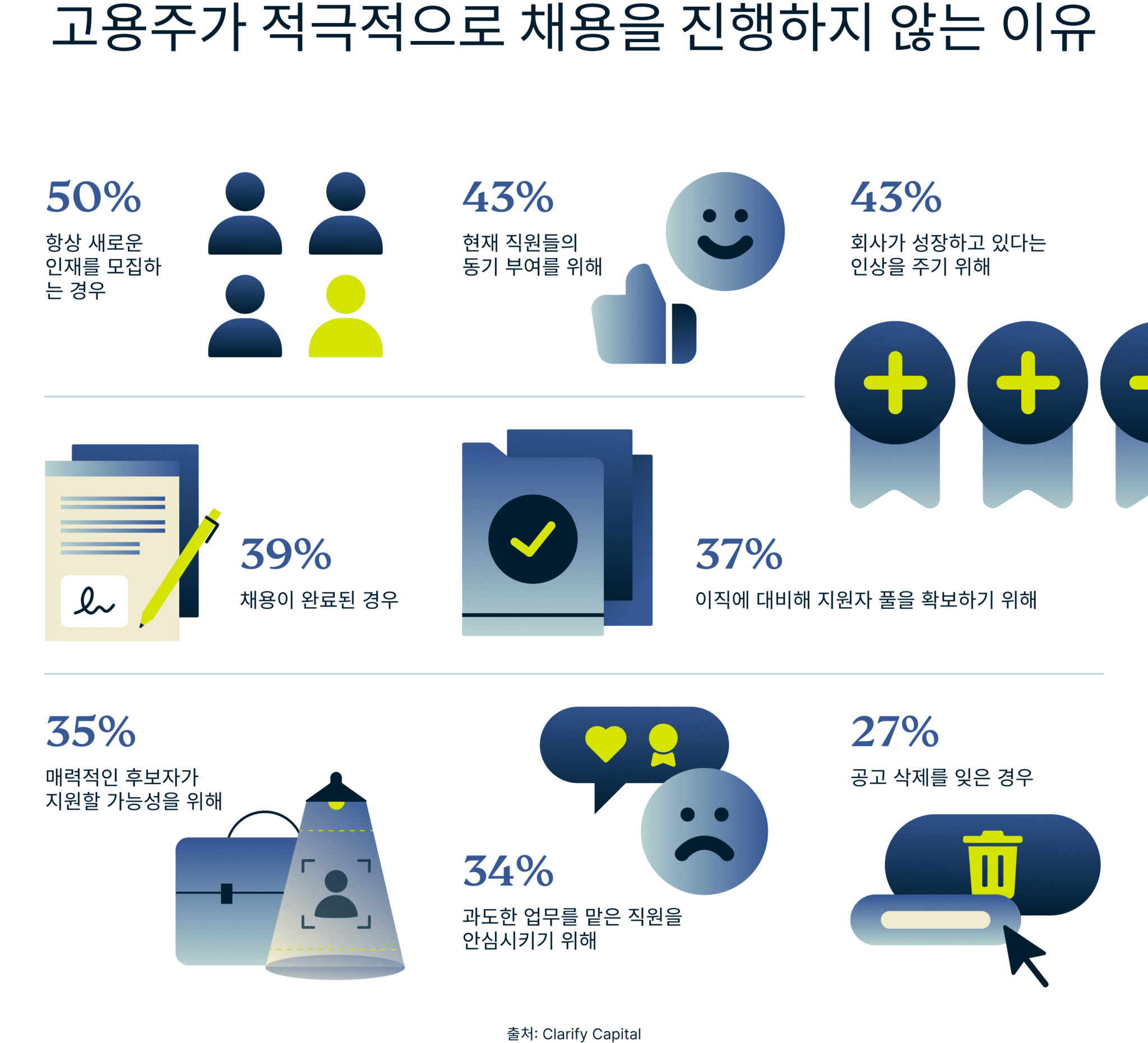 이 연구에서는 채용을 적극적으로 진행하지 않음에도 채용 공고를 계속 게시해 둔 인사 담당자를 찾아 그 이유를 물었습니다. 가장 흔한 이유는 신규 인력이 적극적으로 필요하지 않음에도 불구하고 새로운 인재를 유치하기 위해서였습니다. 그러나 일부 고용주는 현재 직원과 외부 사람들에게 회사가 더 역동적이며 성장하고 있는 것처럼 보이기 위해 채용 공고를 활용하기도 합니다. 다른 고용주들은 이력서 은행을 구축하여 필요할 때 언제든지 필요할 때 바로 찾을 수 있는 리소스로 활용하기도 합니다.