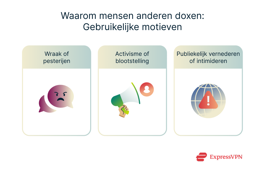 Soms is doxing persoonlijk, bedoeld om te kwetsen of te vernederen. Andere keren wordt het gebruikt om iemand te verraden of een statement te maken. Wat de reden ook is, het doel is meestal hetzelfde: iemand onder druk zetten door zijn privégegevens openbaar te maken.