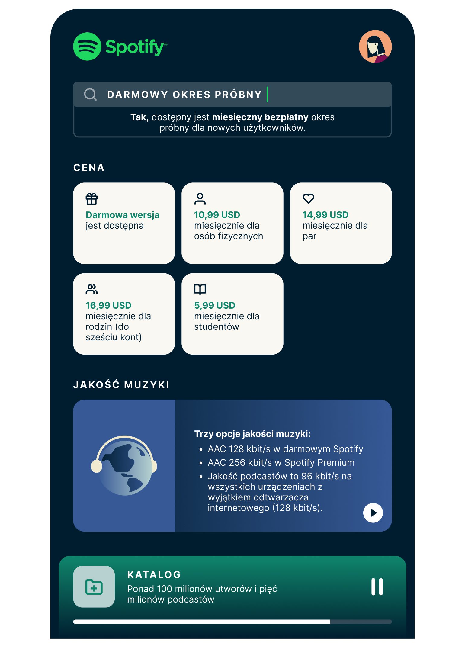 Spotify umożliwia słuchanie muzyki i podcastów na żądanie, tworzenie własnych playlist i udostępnianie ulubionych treści znajomym. Spotify oferuje darmową wersję z reklamami oraz plany premium, które pozwalają na słuchanie muzyki bez reklam, odtwarzanie utworów offline itd. Usługa jest dostępna na wszystkich głównych platformach, w tym komputerach, urządzeniach mobilnych i inteligentnych głośnikach. Jeśli interesuje Cię subskrypcja Spotify Premium, ale nie możesz się zdecydować, postaw na miesięczny bezpłatny okres próbny (dostępny tylko dla nowych użytkowników).