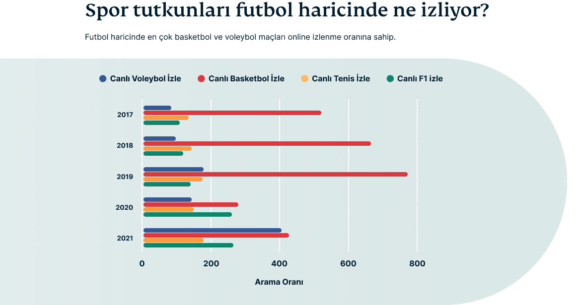 2021’de ise voleybol maçlarına olan ilgide ani bir artış görüyoruz. Aynı yıl içindeki arama oranlarında gerçekleşen artışlar, A Milli Kadın Voleybol Takımının 2020 Tokyo Olimpiyatlarındaki karşılaşmalarına denk geliyor. Filenin Sultanları Tokyo’dan beşinci olarak eve dönmüştü.